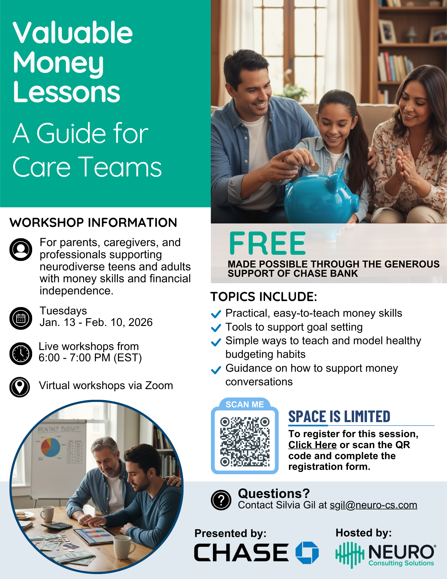 Banking for Independence is FREE virtual financial literacy program. hosted by NCS in collaboration with Chase Bank. Our workshops are designed to help neurodiverse young adults build strong money management skills.