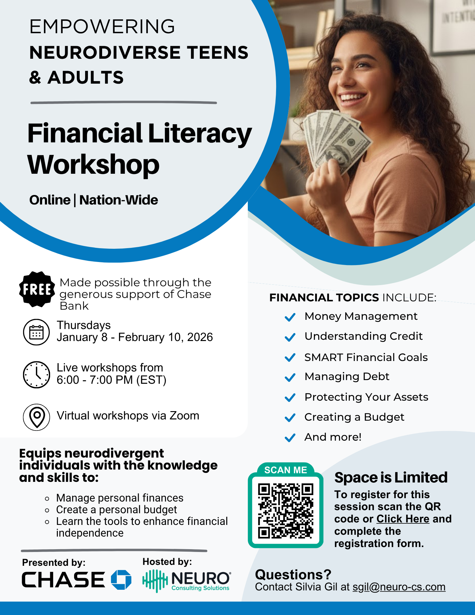 Banking for Independence is FREE virtual financial literacy program. hosted by NCS in collaboration with Chase Bank. Our workshops are designed to help neurodiverse young adults build strong money management skills.